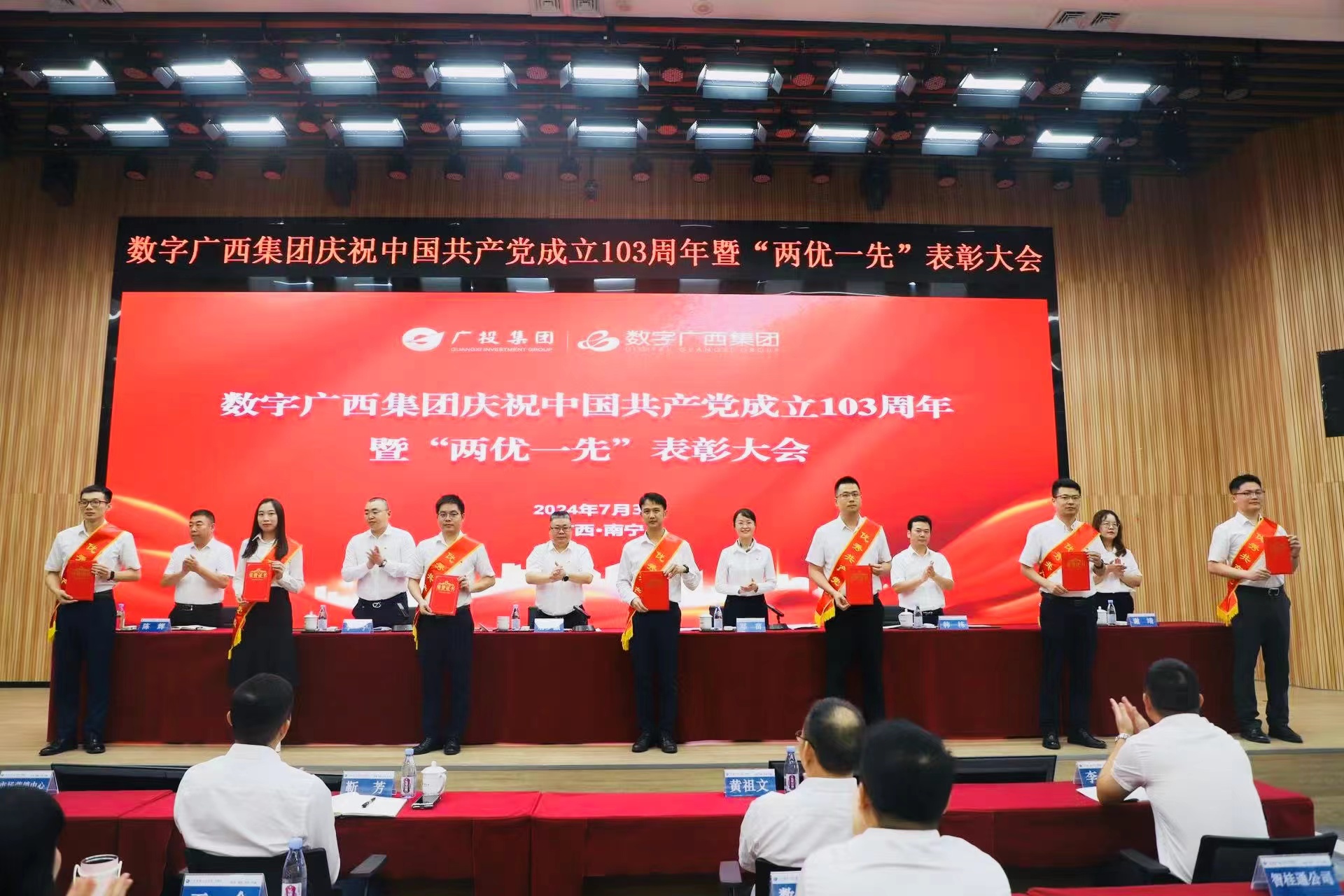 7月3日,,,尊龙时凯集团党委召开庆祝中国共产党成立103周年暨“两优一先”表彰大会,,,,集中表彰公司2023年度优秀共产党员、、优秀党务工作者、、、、先进基层党组织,,,,激励各级党组织和广大党员深入学习贯彻习近平新时代中国特色社会主义思想和习近平总书记关于广西工作论述的重要要求,,,,全面贯彻落实党的二十大精神,,弘扬伟大建党精神,,,坚定理想信念,,切实发挥基层党组织战斗堡垒作用和党员先锋模范作用,,,,在公司高质量发展中贡献更大力量。。广投集团副总经理,,,尊龙时凯集团党委书记、、、、董事长唐少瀛出席会议,,,,公司党委副书记、、职工董事、、、工会主席邓苗宣读2023年度“两优一先”表彰通报,,,,公司纪委书记、、党委委员李宁主持会议。。。。
